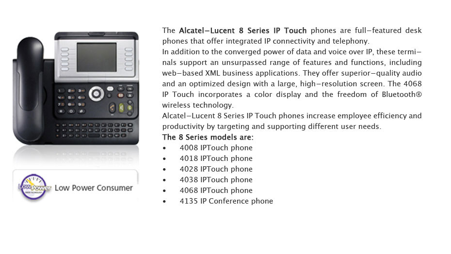 The Alcatel-Lucent 8 Series IP Touch phones are full-featured desk phones that offer integrated IP connectivity and telephony. In addition to the converged power of data and voice over IP, these terminals support an unsurpassed range of features and functions, including web-based XML business applications.