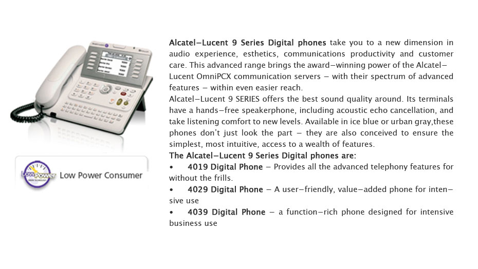 Alcatel-Lucent 9 Series Digital phones take you to a new dimension in audio experience, esthetics, communications productivity and customer care.