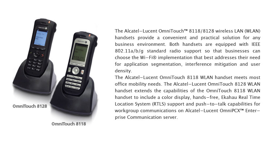 The Alcatel-Lucent OmniTouchâ„¢ 8118/8128 wireless LAN (WLAN) handsets provide a convenient and practical solution for any business environment.