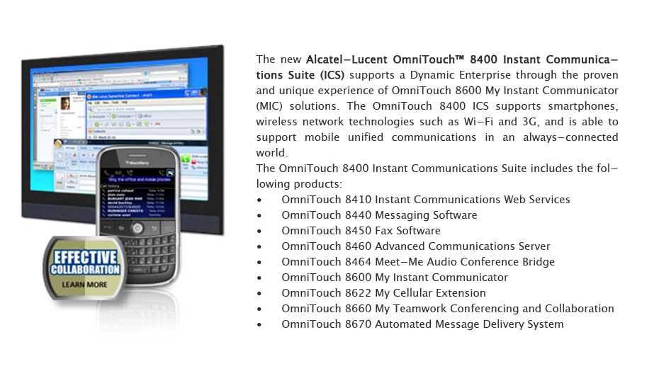 The new Alcatel-Lucent OmniTouchâ„¢ 8400 Instant Communications Suite (ICS) supports a Dynamic Enterprise through the proven and unique experience of OmniTouch 8600 My Instant Communicator (MIC) solutions.