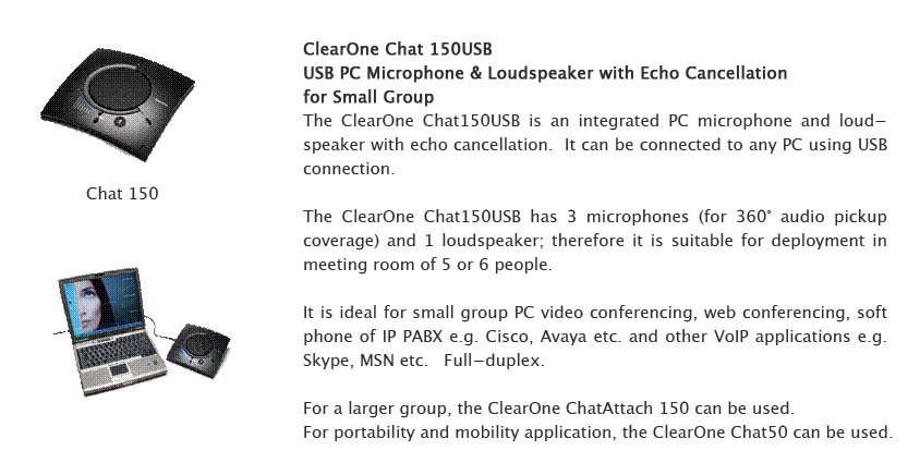 ClearOne ChatAttach 150 is an integrated PC microphone and loudspeaker with echo cancellation. It can be connected to any PC using USB connection.