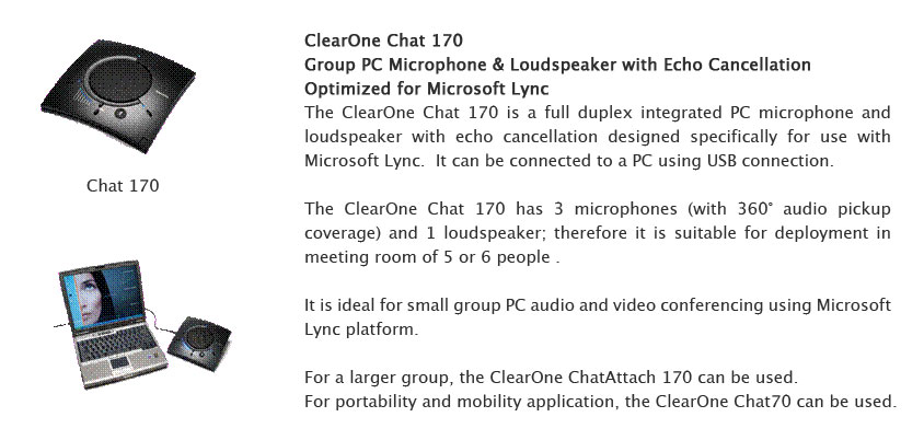 The ClearOne Chat 170 is a full duplex integrated PC microphone and loudspeaker with echo cancellation designed specifically for use with Microsoft Lync. It can be connected to a PC using USB connection.