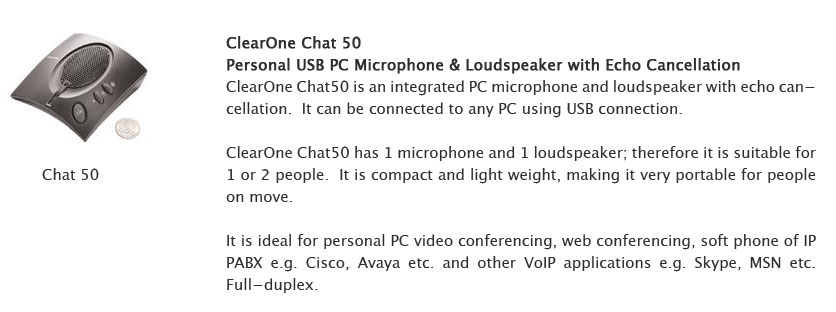 ClearOne Chat60 is an integrated PC microphone and loudspeaker with echo cancellation optimized for Skype. It can be connected to any PC running Skype using USB connection.