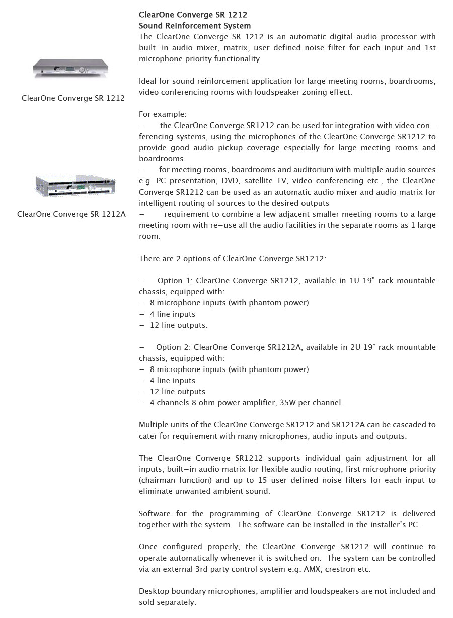 The ClearOne Converge SR 1212 is an automatic digital audio processor with built-in audio mixer, matrix, user defined noise filter for each input and 1st microphone priority functionality. Ideal for sound reinforcement application for large meeting rooms, boardrooms, video conferencing rooms with loudspeaker zoning effect.
