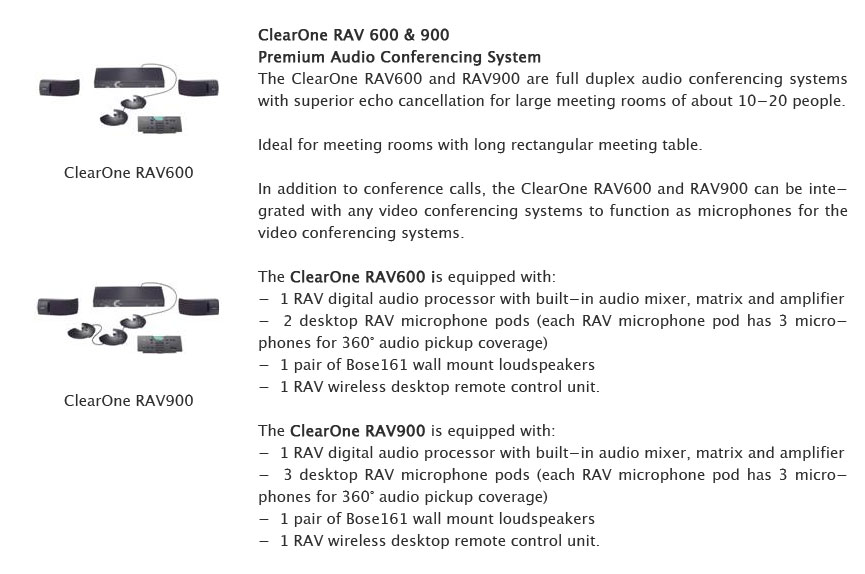 The ClearOne RAV600 and RAV900 are full duplex audio conferencing systems with superior echo cancellation for large meeting rooms of about 10-20 people. Ideal for meeting rooms with long rectangular meeting table. In addition to conference calls, the ClearOne RAV600 and RAV900 can be integrated with any video conferencing systems to function as microphones for the video conferencing systems.