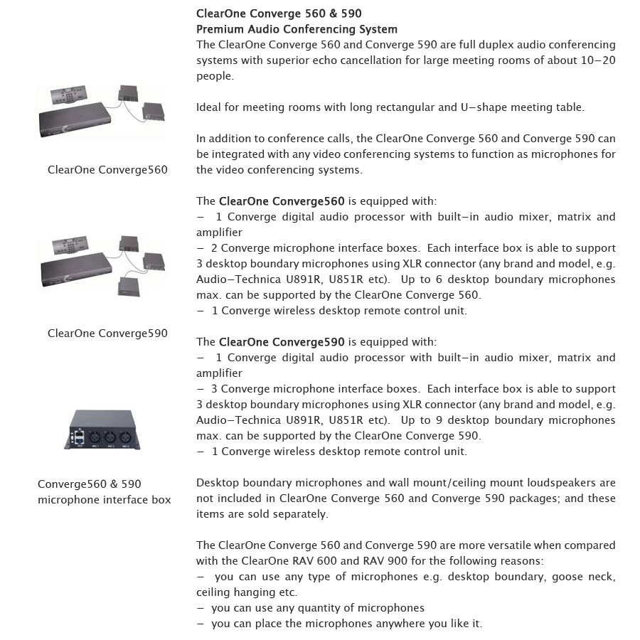 The ClearOne Converge 560 and Converge 590 are full duplex audio conferencing systems with superior echo cancellation for large meeting rooms of about 10-20 people. Ideal for meeting rooms with long rectangular and U-shape meeting table. In addition to conference calls, the ClearOne Converge 560 and Converge 590 can be integrated with any video conferencing systems to function as microphones for the video conferencing systems.