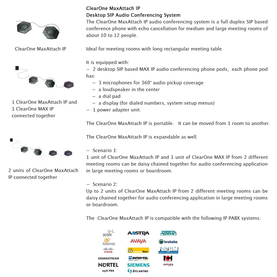 The ClearOne MaxAttach IP audio conferencing system is a full duplex SIP based conference phone with echo cancellation for medium and large meeting rooms of about 10 to 12 people. Ideal for meeting rooms with long rectangular meeting table.