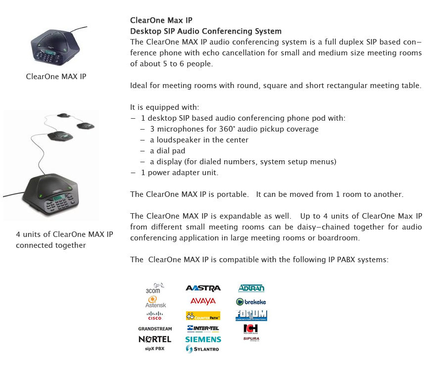 The ClearOne MAX IP audio conferencing system is a full duplex SIP based conference phone with echo cancellation for small and medium size meeting rooms of about 5 to 6 people. Ideal for meeting rooms with round, square and short rectangular meeting table.
