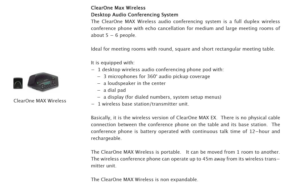 The ClearOne MAX EX audio conferencing system is a full duplex conference phone with echo cancellation for small and medium size meeting rooms of about 5 to 6 people.